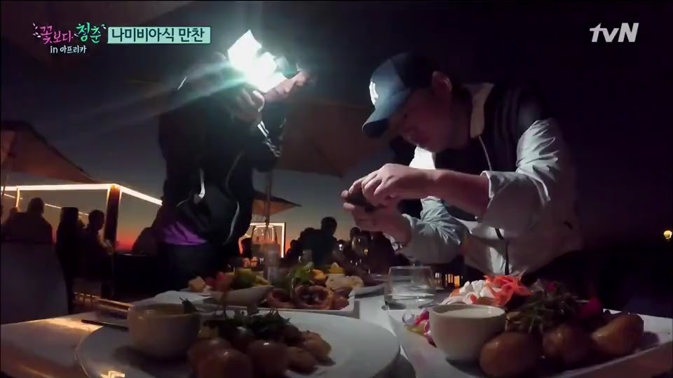 Mereka makan makanan pembuka, menunggu hidangan utama Oppa ke bawah untuk memotret langit senja yang indah WOW.