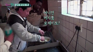 Kembali ke acara masak memasak, Jae Hong dengan kekuatan tangannya sudah berhasil memotong kentang dan kali ini ia menggunakan tangannya untuk menghancurkan bawang putih HAHHAHAHAHAHHAA.